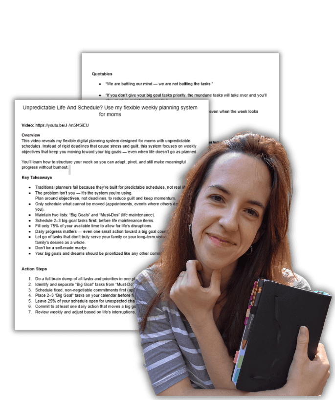 If you want to dive deeper into this approach, I’ve put together notes and key action steps you can download for free. Join my email list to get them, along with access to my entire notes library with other resources to help you balance family life and your goals with confidence.